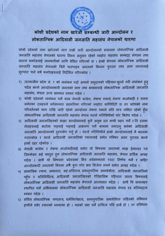 काठमाडौं -नेकपा एमाले निकट लोकतान्त्रिक आदिवासी जनजाती महासंघले प्रदेश नं १ को नाम कोशी मान्नुको विकल्प नभएको जनाएको छ ।