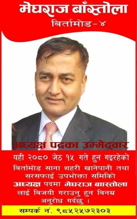 नगरपालिकामा कार्यरत मेघराज बाँस्तोला लोकतान्त्रिक राष्ट्रवादी समुहको तर्फबाट उम्मेद्वार बनेका हुन् । कर्मचारी आचार संहिता विपरित छैटौं तहका कर्मचारी अध्यक्षको उम्मेद्वार भएपछि अन्य दलले विरोध गरेका छन् ।