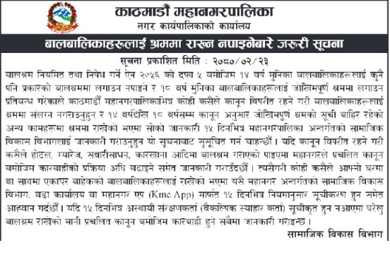 कानुनको उल्लङ्घन गर्दै बालबालिकालाई श्रममा राखेको भएमा सोको जानकारी १५ दिनभित्र महानगरपालिका अन्तर्गतको सामाजिक विकास विभागलाई गराउन महानगरले भनेको छ ।