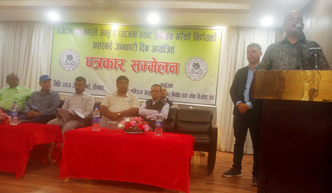 पत्रकार सम्मेलनमा बोल्दै नेपाल कृषिउपज आलु तथा प्याज आयात निर्यात तथा थोक विक्रेता संघका महासचिव प्रकाश गजुरेलले सरकारले जेठ १५ गते प्रस्तुत गरेको आगामी आर्थिक वर्ष २०८०/०८१ बजेट वक्तव्यको एक बुँदा र सँगै प्रस्तुत भएको आर्थिक ऐन, २०८० ले व्यवसाय तथा उपभोक्तालाई समेत प्रतिकुल असर पर्ने बताउनु भयो ।