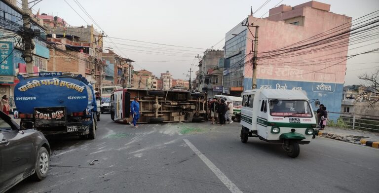 लामाटारबाट लगनखेलतर्फ आउँदै गरेको बा२ख ८५८३ नम्बरको बस महालक्ष्मी नगरपालिका–१ बाहुनधारास्थित सडकबीचमै पल्टिएको हो।