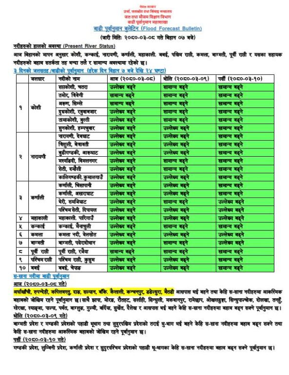 यस्तै, अबका तीन दिन देशका अधिकांश प्रमुख तथा मझौला नदीहरूमा बहाव सतर्कता तहभन्दा तलै रहने महाशाखाले जनाएको छ ।