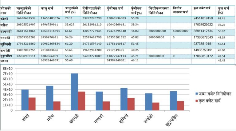 महालेखा नियन्त्रक कार्यालयले उपलब्ध गराएको प्रदेशहरुको बजेट खर्चसम्बन्धी तथ्याङ्कअनुसार ११ महिनामा सबैभन्दा धेरै कोशी प्रदेशले ६१ दशमलव ४१ प्रतिशत र सबैभन्दा कम मधेश प्रदेशले ३६ दशमलव २५ प्रतिशत बजेट खर्च गरेका छन् ।