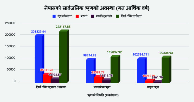 गत वर्षमा ऋणको साँवा ब्याज भुक्तानीमा सरकारले रू दुई खर्ब २२ अर्ब ७४ करोड २१ लाख खर्च गरेको छ । जसमध्ये, आन्तरिक ऋणको साँवा–ब्याज भुक्तानी रू एक खर्ब ७९ अर्ब ७२ करोड ५३ लाख र बाह्य ऋणको साँवा ब्याज भुक्तानीमा रू ४३ अर्ब एक करोड ६८ लाख बराबर खर्च भएको छ।