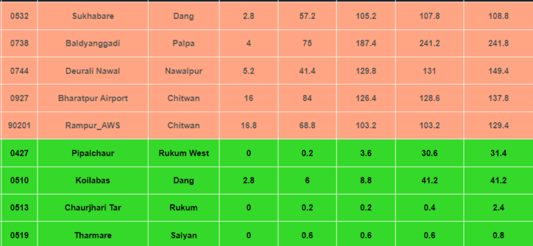 नवलपरासी, रुपन्देही, पाल्पा, प्युठान र आसपासको स्थानमा भारी वर्षा मापन भएको छ । सो क्षेत्र भएर बहने स–साना नदी तथा खोलामा बाढी आएको छ । तिनाउ नदीका सहायक, पश्चिम राप्ती नदीका सहायक नदीहरूमा आकस्मिक बहाव भएकाले जोखिमबाट बच्न सतर्कता अपनाउन महाशाखाले अनुरोध गरेको छ ।