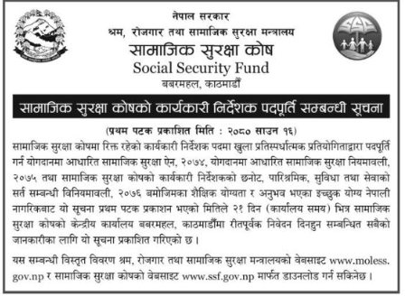 काठमाडौँ-सामाजिक सुरक्षा कोषले कार्यकारी निर्देशकका लागि आवेदन आह्वान गरेको छ । सामाजिक सुरक्षा कोषमा रिक्त रहेको कार्यकारी निर्देशक पदमा खुला प्रतिस्पर्धात्मक प्रतियोगिताद्वारा पदपूर्तिका लागि दरखास्त आह्वान गरिएको हो ।