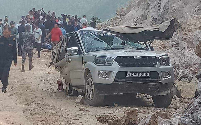 सडकमाथिबाट खसेको सुक्खा पहिराले स्कारपियो पुरिँदा तीनजनाको घटनास्थलमा नै मृत्यु भएको थियो। गाडीमा सवार अन्य आठजना घाइते भएका छन् । अहिले घाइतेहरूको प्रभासस्थित लुम्बिनी मेडिकल कलेजमा उपचार भइरहेको छ।