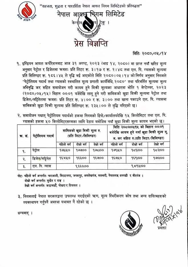 नेपाल आयल निगमले बिहीबार विज्ञप्ति जारी गर्दै पेट्रोलियम पदार्थको मूल्यमा वृद्धि भएको जनाएको हो।