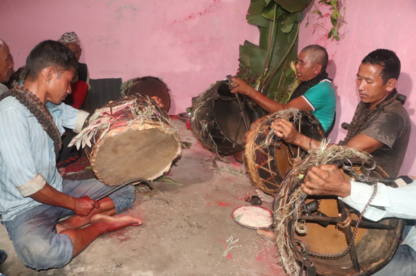 धादिङ–गलामा रुद्राक्षको माला, त्यसैमाथि घण्टी । छालाले मोहोरिएको एकपाखे ढ्याङ्ग्रोमा पनि घण्टी र घलामहरू झुन्ड्याइएको छ । गाउँभरिका मानिस एकैठाउँमा जम्मा भएर चेपाङ झाँक्री न्वागी फलाक्दै थिए । जति रात छिप्पिँदै गयो ढ्याङ्ग्रो, घण्टी र घलामबाट आवाज चर्किँदै थिए । मन्द आवाजमा केही फलाकेजस्तो त कोही गुनगुनाएजस्तो आवाज वरपर पनि गुन्जायमान थिए । त्यही ढ्याङ्ग्रो ठोकेर फलाक्नेमध्येका एक हुनुहुन्थ्यो धादिङ गजुरी गाउँपालिका–५ बरभञ्ज्याङका राजकुमार चेपाङ ।