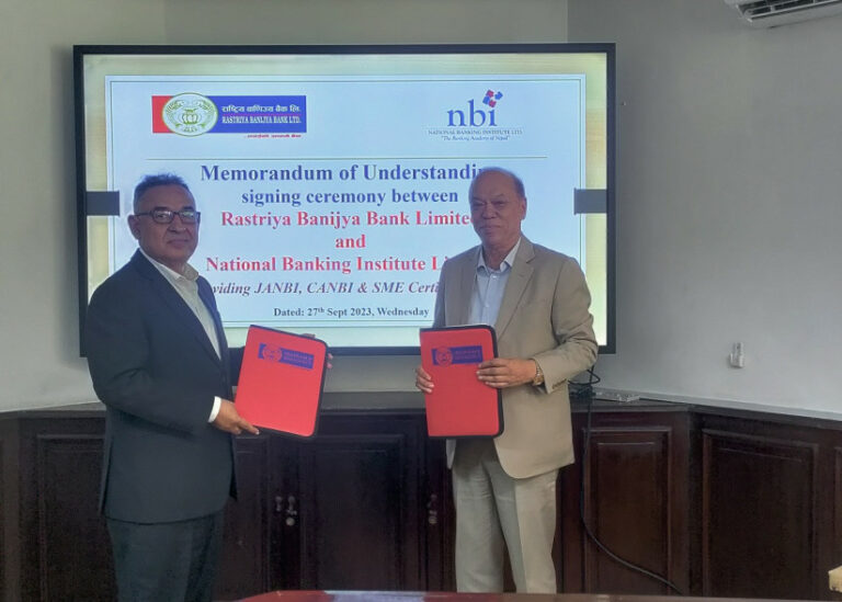 काठमाडाैं-राष्ट्रिय वाणिज्य बैंक लिमिटेड र नेसनल बैंकिङ इन्स्टिच्युट लिमिटेड (एनबीआई)बीच सर्टिफिकेसन कोर्सको बैंकिङ तालिम सञ्चालन गर्ने सम्झौता भएको छ।