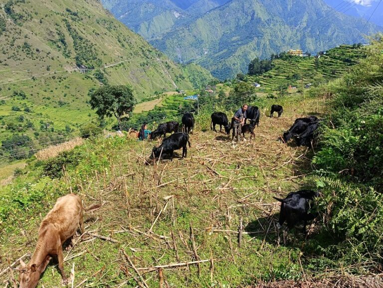 धौलागिरि गाउँपालिका–३ मुनाका बालकृष्ण मगरले ढोरपाटनको जलजला र धनमाने खर्कमा तीन महिना बुकीको घाँस खुवाएका गाइगोरुको गोठ ल्याएर गत हप्ता गाउँमा झरेको बताउनुभयो । “वैशाखमा उभौलीको पूजा गरेर लेकतिर लागेको गोठ पालुवा पलाउँदै गरेको घाँस खुवाउँदै जेठको अन्तिममा जलजलाको धनमाने खर्कमा पुगेका थियो”, उहाँले भन्नुभयो, “तीन महिना बुकीमा चराएर अहिले गाउँको मकै बारीमा उम्रिएको ल्योस (घाँस) खुवाउन ल्याएको हो ।”