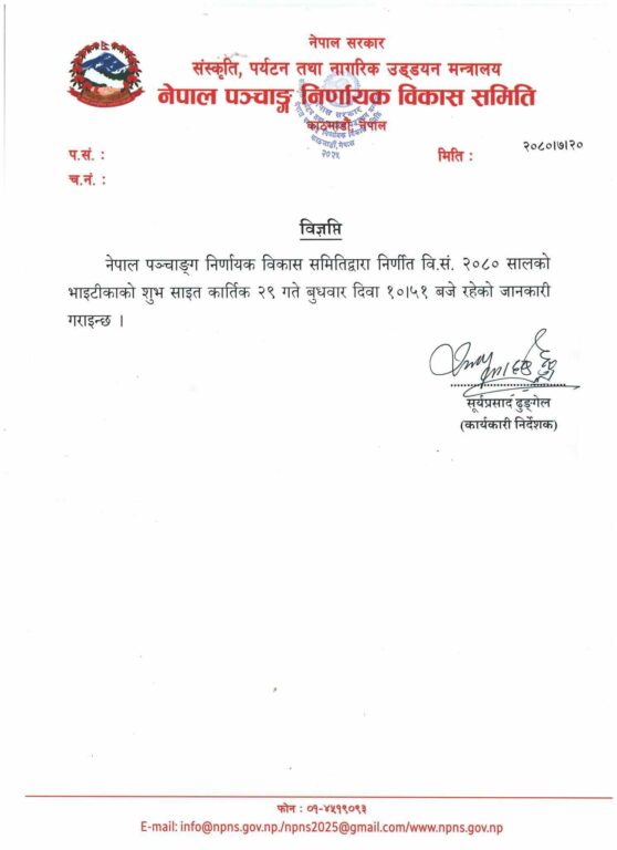 ‘भाइटीकाको शुभ साइत कार्तिक २९ गते बुधवार बिहान १०ः५१ बजे रहेको जानकारी गराइन्छ,’ समितिका कार्यकारी निर्देशक सूर्यप्रसाद ढुंगेलले जारी गरेको विज्ञप्तिमा भनिएको छ।