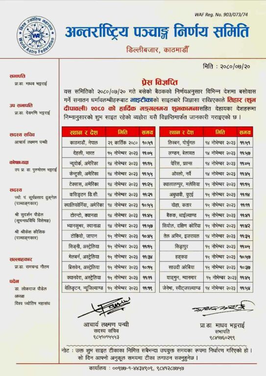 त्यस्तै, समितिको सोमबार बसेको बैठकले अन्य देशका लागि पनि भाइटीकाका लागि मिति र समय तोकेको छ। अन्तर्राष्ट्रिय पञ्चाङ्ग निर्णायक समितिले देश अनुसारको भाइटिका लगाउने समय सार्वजनिक गरेको छ।