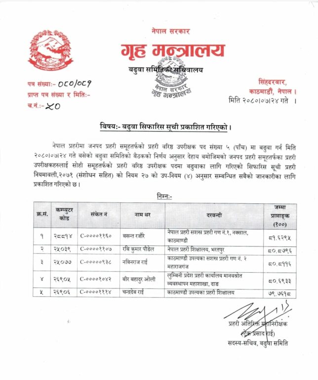 शुक्रबार बसेको बढुवा सिफारिस समितिको बैठकले एसपी वसन्त रजौरे, रविकुमार पौडेल, नविराज राई, वीरबहादुर ओली र चन्द्रदेव राईलाई बढुवा गर्न सिफारिस गरेको हो ।