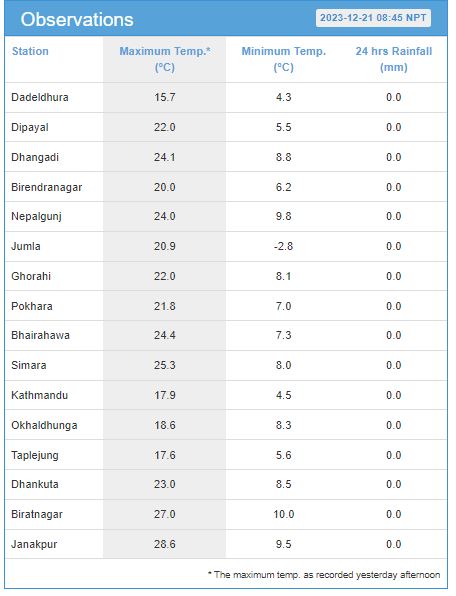 यस्तै जुम्लाको तापक्रम सबैभन्दा कम माइनस २.८ डिग्री सेल्सियस मापन गरिएको छ ।