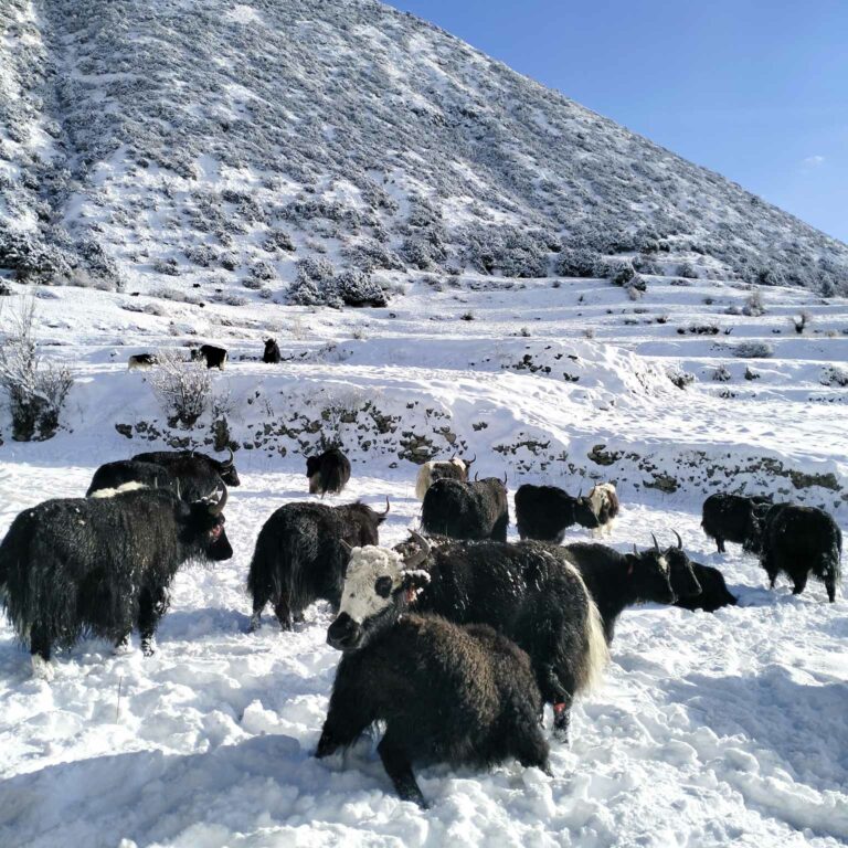 पशुपालक किसानलाई ‘न त घाम न त वर्षाले असर गर्छ’ भने झैँ यहाँका किसानलाई न त हिउँले रोक्न सकेको छ न त घामले नै छेक्न सकेको छ । हिउँ पर्न थालिसकेकाले यहाँका गोठ वरिपरि सेताम्मे हिउँ छन् यतिबेला । यही गोठ वरपर सेताम्मे हिउँ हटाउँदै आउनुभएका मनाङ ङिस्याङ गाउँपालिका–५ भ्राकाका ६० वर्षीया याङ्चु खण्डा लामा गोठमै बसेर उमेर गुज्रिएको बताउनुहुन्छ ।