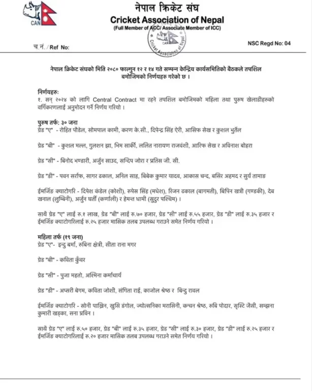 पुरुष खेलाडीहरुलाई ग्रेड ए, ग्रेड बी, ग्रेड सी र ग्रेड डी गरी चार भागमा वर्गिकरण गरिएको छ। ग्रेडअनुसार ए ग्रेडका खेलाडीले मासिक १ लाख पारिश्रमिक पाउनेछन्। यस्तै, क्रमशः बी ग्रेडका खेलाडीलाई ७०, सी का लाई ५५ र डी ग्रेडका खेलाडीलाई ३५ हजार तलब निर्धारण गरिएको क्यानले जनाएको छ। यस्तै इमर्जिङ क्याटोगरिका खेलाडीलाई २५ हजार मासिक तलब निर्धारण गरिएको छ।