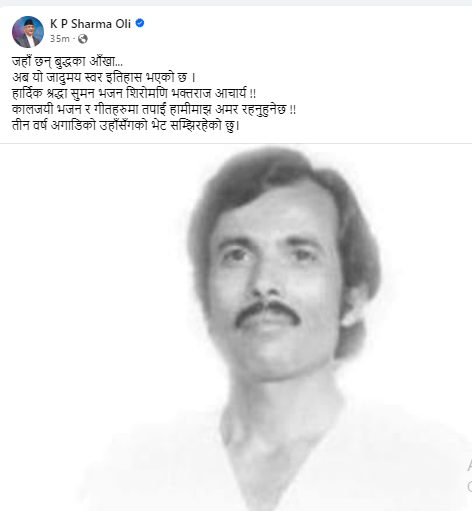 कालजयी गायक तथा संगीतकार आचार्यको निधनले आफू अत्यन्त दुःखी भएकाे अध्यक्ष ओलीले सामाजिक सञ्जाल फेसबुकमा उल्लेख गर्नुभएकाे हो।