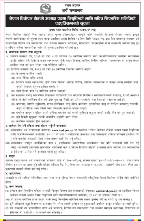 काठमाडौँ– नेपाल धितोपत्र बोर्डको अध्यक्षका लागि आवेदन माग गरिएको छ ।
