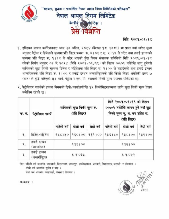 पेट्रोल र एलपी ग्यासको मूल्य यथावत राखिएको निगमले जनाएको छ। त्यस्तै, हवाइ इन्धनको मूल्य वृद्धि भएको छ।