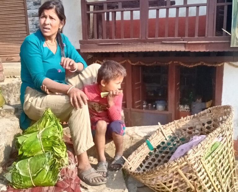 'कमाउन विदेश जानुभएका श्रीमान् बिरामी हुनुहुन्छ। कलकलाउँदा उमेरका तीन छोराछोरी छन्। अहिले त सानो बाबु पनि ठीक हुँदैछ”, गहभरी आँसु पार्दै उहाँले भन्नुभयो, 'बनीबुतो गरेको पैसाले दैनिक हातमुख जोड्न धौ-धौ छ। सालको पात टिपेर बेच्दै थिएँ त्यो पनि डढेलोले केही महिनालाई नपाइने भयो।'