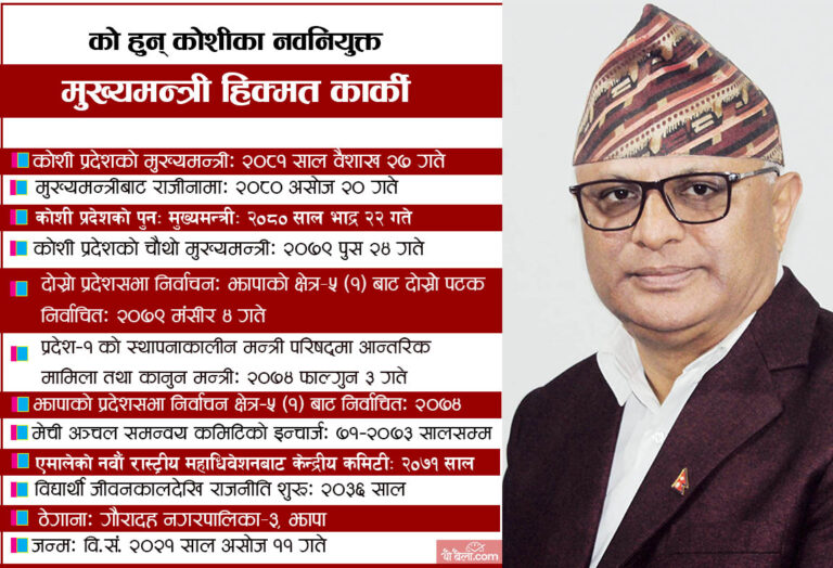 विराटनगर-नेकपा एमाले कोशी प्रदेश संसदीय दलका नेता हिक्मतकुमार कार्की कोशी प्रदेशकाे मुख्यमन्त्री नियुक्त हुनुभएको छ। काेशी प्रदेश प्रमुख पर्शुराम खापुङले बुधबार नयाँ सरकार गठनको आह्वान गरेअनुसार बिहीबार दिउँसो कार्कीलाई संविधानको धारा १६८ को उपधारा (५) अनुसार मुख्यमन्त्रीमा नियुक्त गरेका हुन्।
