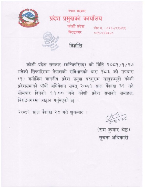 विराटनगर-कोशी प्रदेशका प्रमुख परशुराम खापुङ्गले बजेट अधिवेशन आह्वान गर्नुभएको छ।