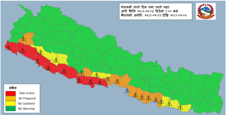 ती भू-भागहरूमा आगामी ३ दिन (जेठ १३ गतेदेखि जेठ १५ गते) सम्म तातो हावा तथा तातो लहरको सम्भावना रहेको महाशाखाको भनाई छ। त्यसैले आवश्यक तयारी गर्न तथा आवश्यक सतर्कता अपनाउन महाशाखाले अनुरोध गरेको छ।