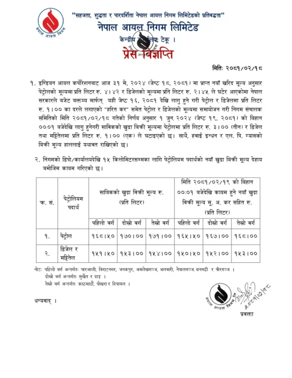 अब काठमाडौं उपत्यकामा पेट्रोलको मूल्य १६८ रुपैयाँ प्रतिलिटर कायम भएको छ। डिजेल र मट्टितेलको प्रतिलिटर १५३ रुपैयाँ भएको छ। निगमका अनुसार हवाई इन्धन र एलपी ग्यासको मूल्य भने हालयथावत रहेको छ।