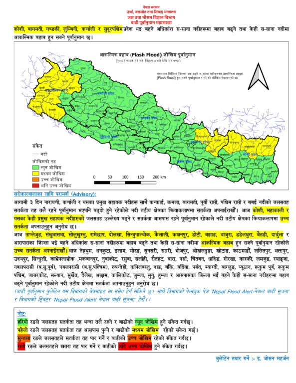 बाढी महाशाखाका अनुसार आज ताप्लेजुङ, संखुवासभा, सोलुखुम्बु, रामेछाप, दोलखा, सिन्धुपाल्चोक, कैलाली, कञ्चनपुर, डोटी, बझाङ, बाजुरा, डडेलधुरा, बैतडी, दार्चुला र आसपासका जिल्ला भई बहने अधिकांश नदीमा बहाव बढ्ने तथा केहीमा आकस्मिक बहाव हुन सक्ने अनुमान छ।