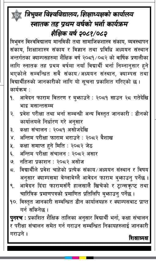 वार्षिक प्रणालीका लागि स्नातक तह प्रथम वर्षमा नयाँ विद्यार्थी भर्नाको सम्पूर्ण कार्यतालिका नै सार्वजनिक गरिएको हो। साउन २८ गतेदेखि भदौ मसान्तसम्म आवेदन फाराम बुझाउने म्याद दिइएको छ।