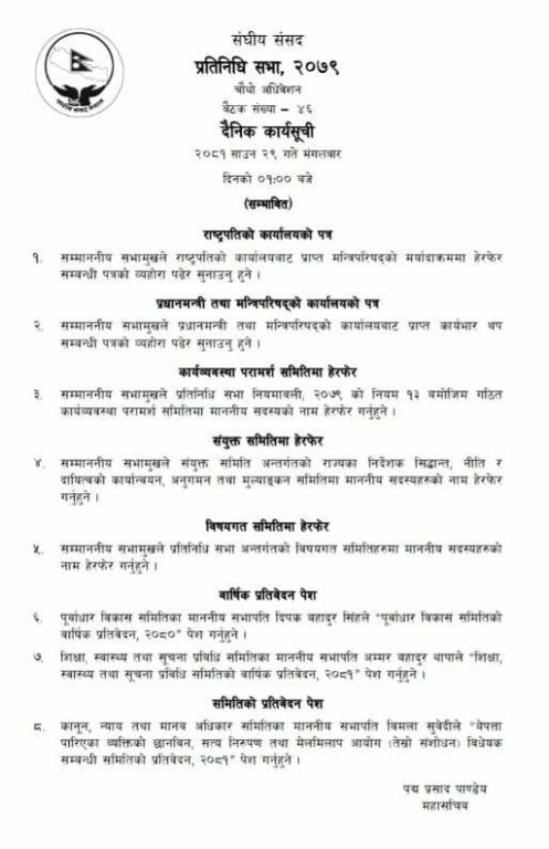 बैठकमा सभामुख देवराज घिमिरेले राष्ट्रपतिको कार्यालयबाट प्राप्त मन्त्रिपरिषद्को मर्यादाक्रममा हेरफेर सम्बन्धी पत्रको ब्यहोरा पढेर सुनाउने कार्यसूचीमा उल्लेख छ। प्रतिनिधि सभा अन्तर्गतको विषयगत समितिहरूमा सदस्यहरूको नाम हेरफेर गर्ने विषय पनि आजको कार्यसूचीमा थपिएको छ।