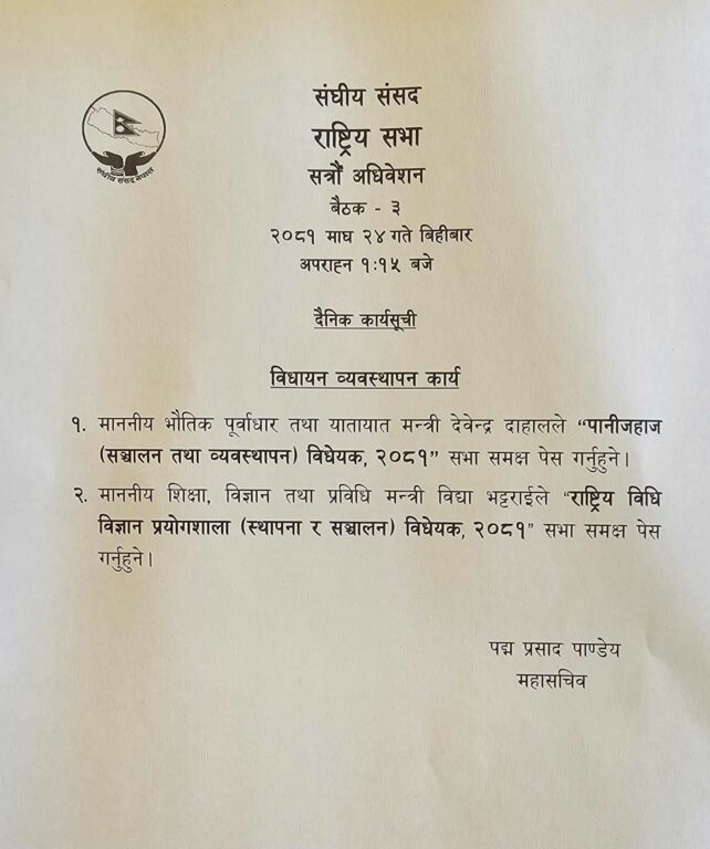 काठमाडौं-प्रतिनिधि सभा र राष्ट्रिय सभामा आज अध्यादेश स्वीकृतिका लागि निर्णयार्थ पेस नहुने भएको छ। दुवै सदनको कार्यव्यवस्था परामर्श समितिको बैठकले अध्यादेश निर्णयार्थ पेस गर्ने सूची हटाउने भएका हुन्।