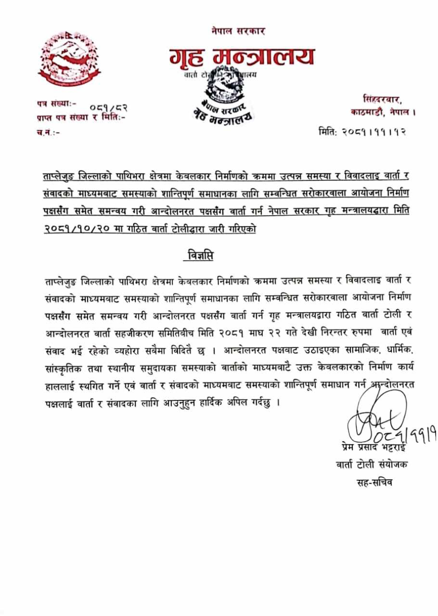 ताप्लेजुङ जिल्लाको पाथीभरा क्षेत्रमा केबलकार निर्माण गर्ने क्रममा विवाद उत्पन्न भई तनाव सिर्जना भएपछि गृह मन्त्रालयले गत माघ २० गते वार्ता टोली गठन गरेको थियो। पाथीभरा क्षेत्रमा केबलकार बनाउन हुँदैन भनेर आन्दोलन बढ्दै गएपछि सरकारले गत माघ २० गते वार्ता टोली गठन गरेको थियो।