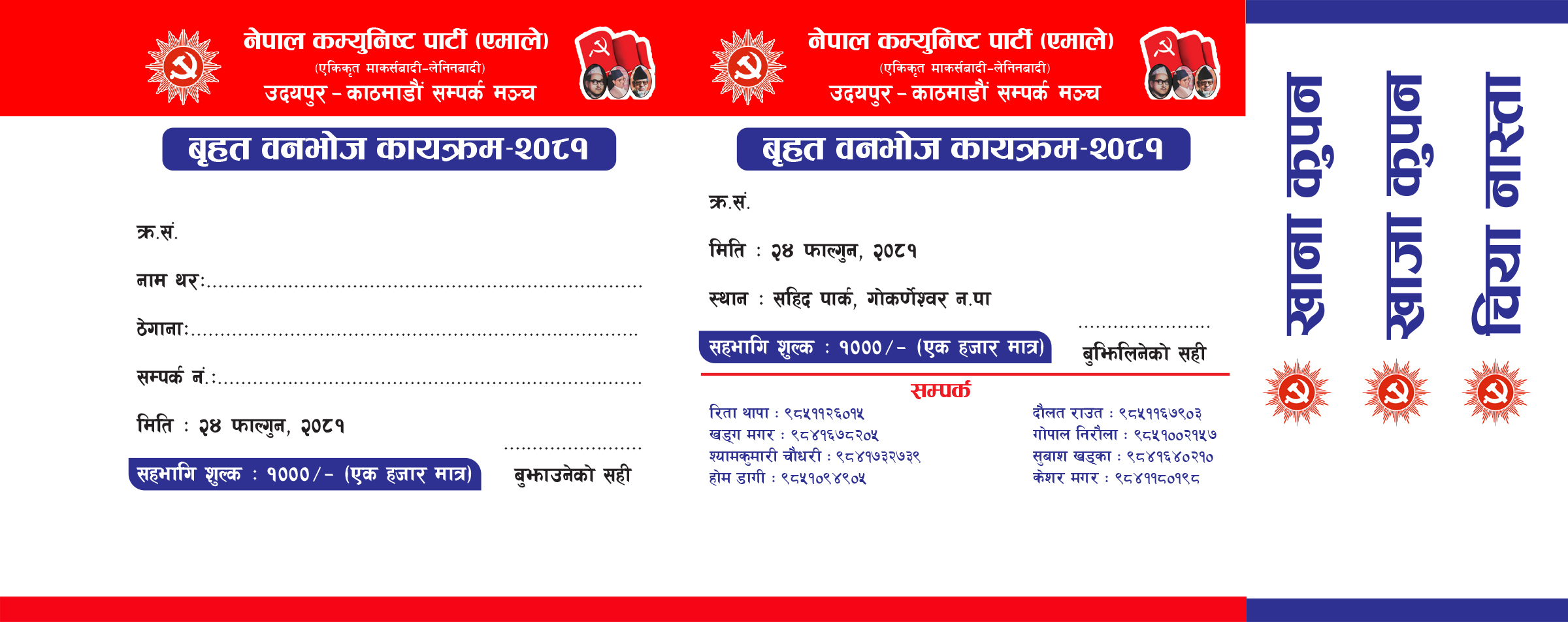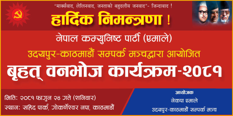 काठमाडौं-नेकपा एमाले उदयपुर-काठमाडौं सम्पर्क मञ्चले ‘बृहत् वनभोज कार्यक्रम-२०८१’ गर्ने भएको छ। सम्पर्क मञ्चले २०८१ फागुन २४ गते शनिवार, सहित पार्क, गोकर्णेश्वर नगरपालिका काठमाडौंमा बृहत् वनभोज, भेटघाट तथा शुभकामना आदान प्रदान कार्यक्रमको आयोजना गर्ने भएको हो।