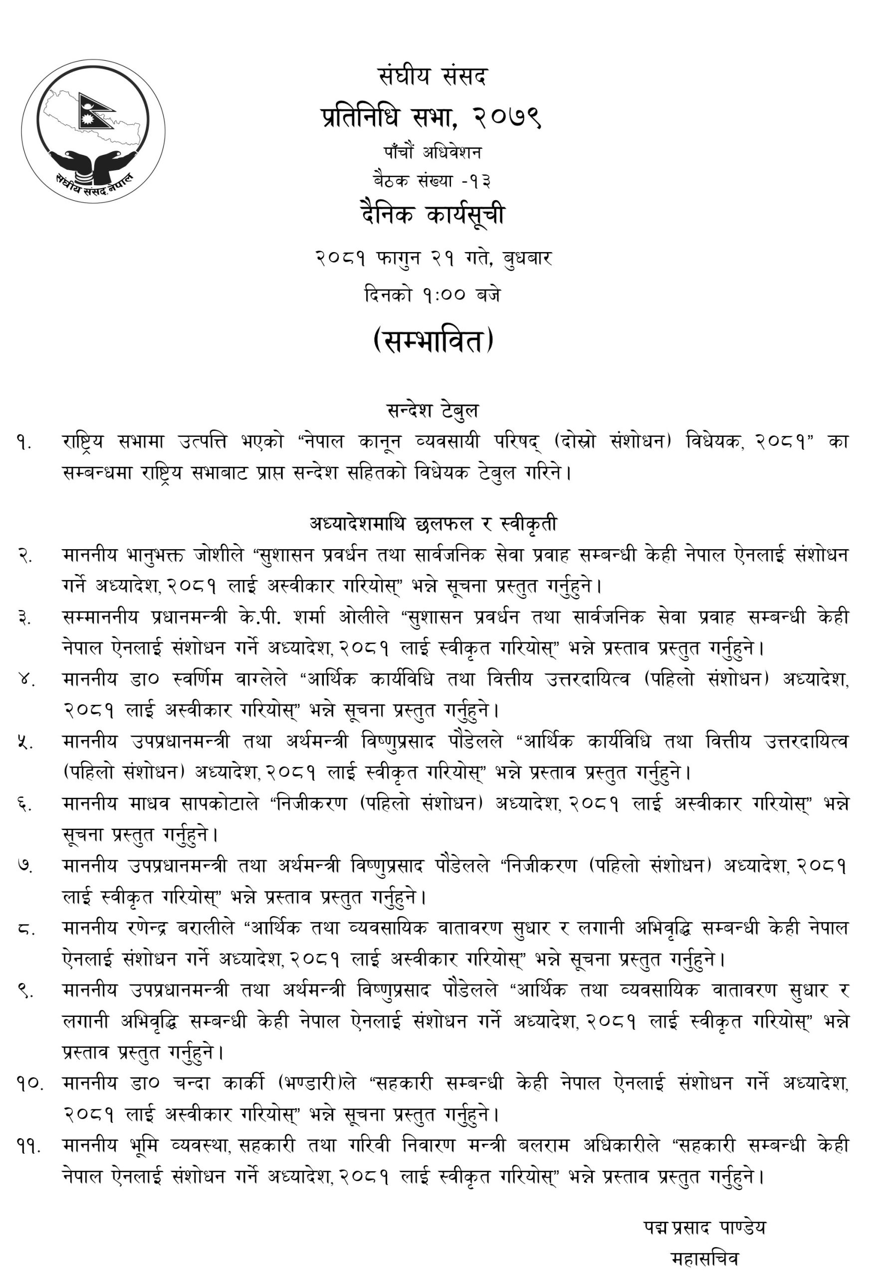 काठमाडौँ-प्रतिनिधिसभाको बैठक २०८१ फागुन २१ गते बुधबार बस्ने भएको छ। आज मंगलबार बसेको प्रतिनिधिसभाको कार्यव्यवस्था परामर्श समितिको बैठकले अध्यादेश स्वीकृतिका लागि निर्णयार्थ पेस गर्ने कार्यसूची तय गरेको हो।