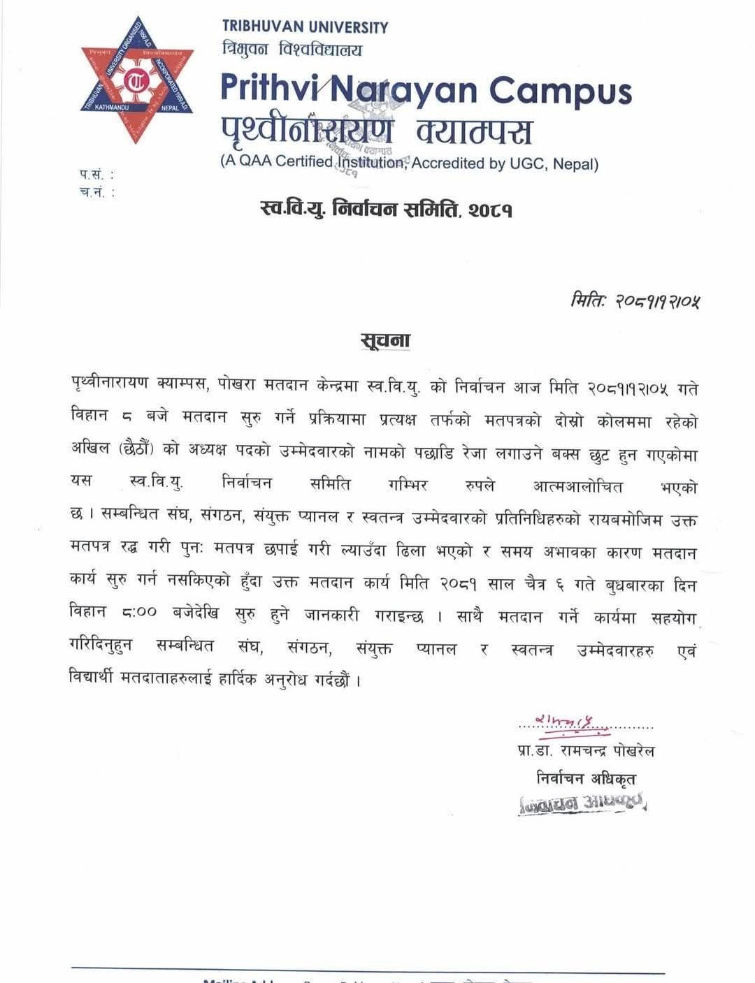 ‘मतदान केन्द्रमा स्ववियुको निर्वाचन मंगलबार बिहान ८ बजे मतदान सुरु गर्ने प्रक्रियामा प्रत्यक्षतर्फको मतपत्रको दोस्रो कोलममा रहेको अखिल (छैठौं) को अध्यक्ष पदको उम्मेदवारको नामको पछाडि रेजा लगाउने बक्स छुट हुन गएकोमा स्ववियु निर्वाचन समिति गम्भीररूपले आत्मआलोचित भएको छ। सम्बन्धित संघ, संगठन, संयुक्त प्यानल र स्वतन्त्र उम्मेदवारको प्रतिनिधिहरूको रायबमोजिम उक्त मतपत्र रद्द गरी पुनः मतपत्र छपाई गरी ल्याउँदा ढिला भएको र समय अभावका कारण मतदान कार्य सुरू गर्न नसकिएको हुँदा उक्त मतदान कार्य चैत्र ६ गते बुधबारका दिन बिहान ८ः०० बजेदेखि सुरू हुने जानकारी गराइन्छ,’ निर्वाचन समितिले जनाएको छ।