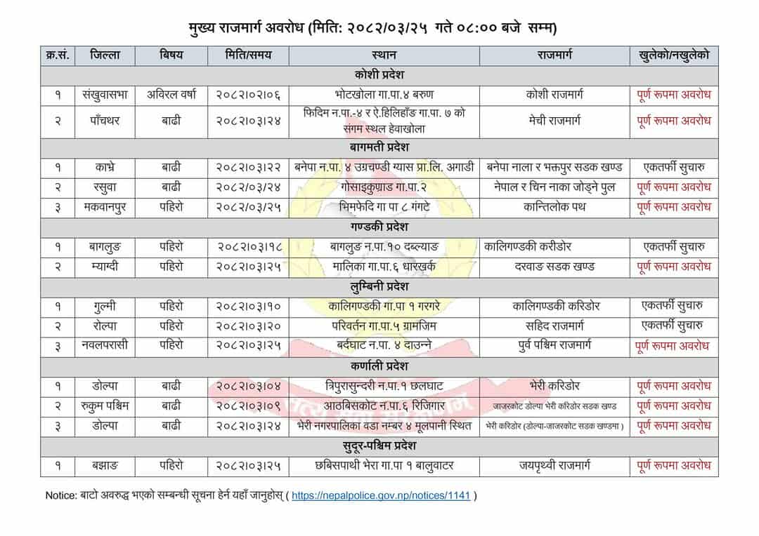 गण्डकी प्रदेशमा कालिगण्डकी करिडोरको बागलुङ खण्ड एकतर्फी सुचारु छ भने म्याग्दीको दरवाङ सडक खण्ड पूर्ण रूपमा अवरुद्ध छ। लुम्बिनी प्रदेशको गुल्मी र रोल्पामा पनि कालिगण्डकी करिडोर र शहीद राजमार्ग एकतर्फी रूपमा चलिरहेका छन्।