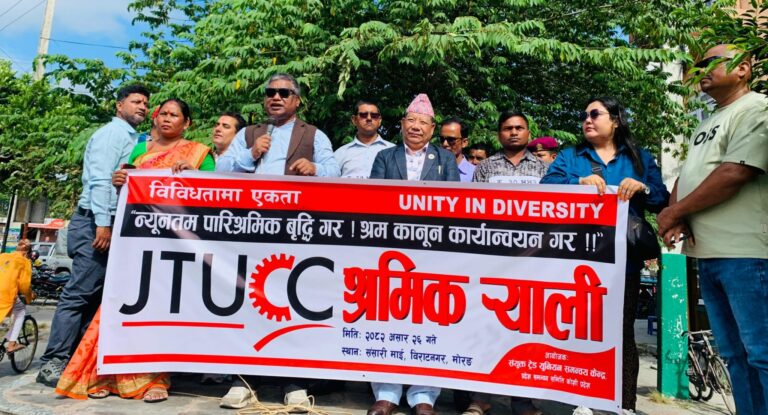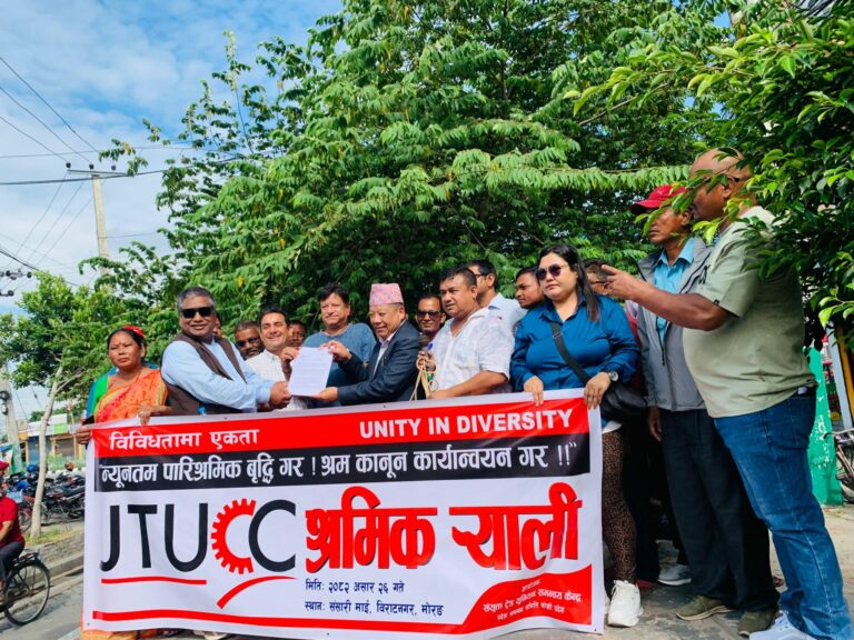 विराटनगर-संयुक्त ट्रेड युनियन समन्वय केन्द्र, प्रदेश समन्वय समिति कोशी प्रदेशले न्यूनतम पारिश्रमिक वृद्धि र श्रम कानून कार्यान्वयन सम्बन्धमा प्रदेश सरकारलाई ज्ञापनपत्र बुझाएको छन्।