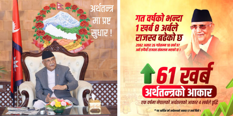 ‘अर्थतन्त्रमा प्रष्ट सुधार’ सामाजिक सञ्जालमा लेख्दै प्रधानमन्त्री ओलीले भन्नुभएको छ, ‘हामी सरकारमा आएको एक वर्षमा अर्थतन्त्रको आकार ४ खर्ब बढेर ६१ खर्ब पुगेको छ। राजश्व गत वर्षको भन्दा १ खर्ब ८ अर्ब बढेको छ। पूँजीगत खर्च अघिल्लो वर्षभन्दा ३६ अर्ब बढी । आर्थिक वृद्धिदर ४.६१ प्रतिशत प्रक्षेपण, अघिल्लो वर्ष ३.८७ प्रतिशत ।’