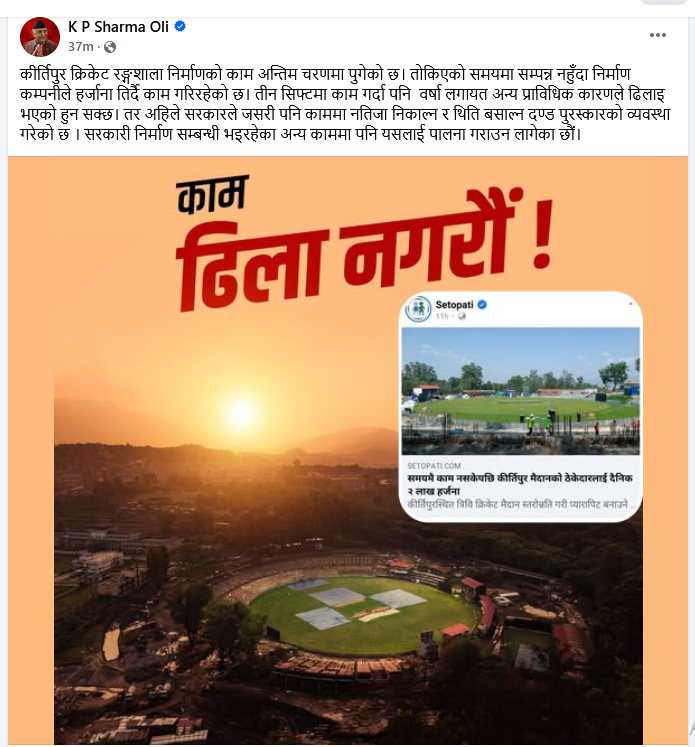 ‘कीर्तिपुर क्रिकेट रङ्गशाला निर्माणको काम अन्तिम चरणमा पुगेको छ, तोकिएको समयमा सम्पन्न नहुँदा निर्माण कम्पनीले हर्जाना तिर्दै काम गरिरहेको छ, तीन सिफ्टमा काम गर्दा पनि वर्षा लगायत अन्य प्राविधिक कारणले ढिलाइ भएको हुन सक्छ’, सामाजिक सञ्जाल फेसबुकमा ओलीले लेख्नुभएको छ।