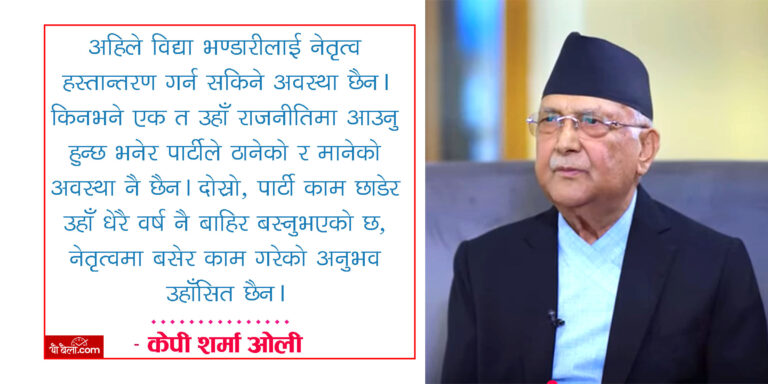 प्रधानमन्त्री ओलीले पूर्वराष्ट्रपति भण्डारीलाई नेतृत्व हस्तान्तरण गर्न नसकिने स्पष्ट पार्नुभएको छ। प्रधानमन्त्री ओलीले भन्नुहुन्छ, ‘अहिले उहाँलाई नेतृत्व हस्तान्तरण गर्न सकिने अवस्था छैन। किनभने एक त उहाँ राजनीतिमा आउनु हुन्छ भनेर पार्टीले ठानेको र मानेको अवस्था नै छैन। दोस्रो, पार्टी काम छाडेर उहाँ धेरै वर्ष नै बाहिर बस्नुभएको छ, नेतृत्वमा बसेर काम गरेको अनुभव उहाँसित छैन।’