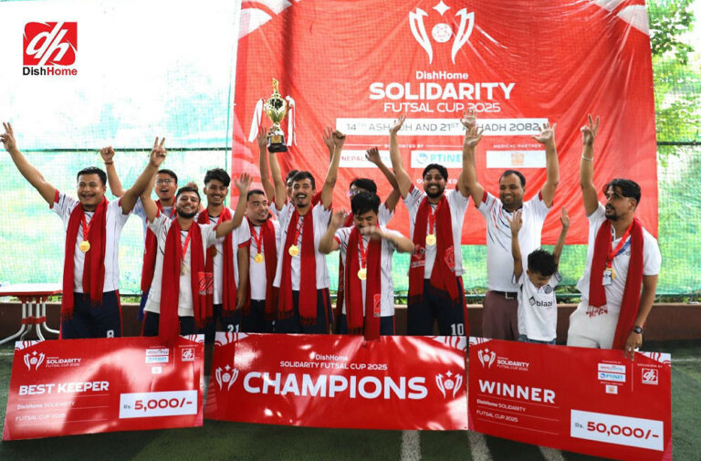 ललितपुर-डिशहोमले आयोजना गरेको पहिलो ‘डिशहोम सोलिडारिटी फुटसल कप २०२५’ सम्पन्न भएको छ। ललितपुरकाे भैँसेपाटीस्थित वन ट्री हिल फुटसलमा व्यावसायिक साझेदार कम्पनीहरूबीच असार १४ र २१ गते आयोजित फुटसल प्रतियोगितामा १४ कम्पनीलाई प्रतिनिधित्व गर्दै १७ टिम सहभागी भएका थिए।