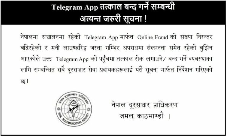 सूचनामा भनिएको छ, ‘नेपालमा सञ्चालनमा रहेको टेलिग्राम एपमार्फत् मार्फत अनलाइन ठगीको सङ्ख्या निरन्तर बढिरहेको र मनी लाउण्डरिङ्ग जस्ता गम्भीर अपराधमा संलग्नता समेत रहेको बुझिन आएकोले उक्त टेलिग्राम एपको पहुँचमा तत्काल रोक लगाउने/बन्द गर्ने व्यवस्थाका लागि सम्बन्धित सबै दूरसञ्चार सेवा प्रदायकहरूलाई यसै सूचना मार्फत निर्देशन गरिएको छ।’