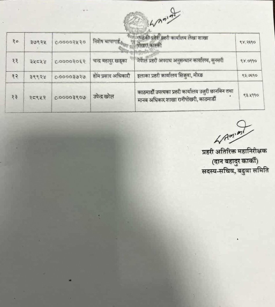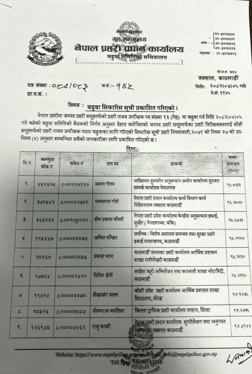 काठमाडौँ-नेपाल प्रहरीको प्रहरी नायब उपरीक्षक (डीएसपी) मा बढुवाका लागि १३ जनाको नाम सिफारिस भएको छ। प्रहरी निरीक्षक (इन्स्पेक्टर) हरूबाट १३ जनालाई डिएसपीमा बढुवा गर्न सिफारिस गरिएको हो।