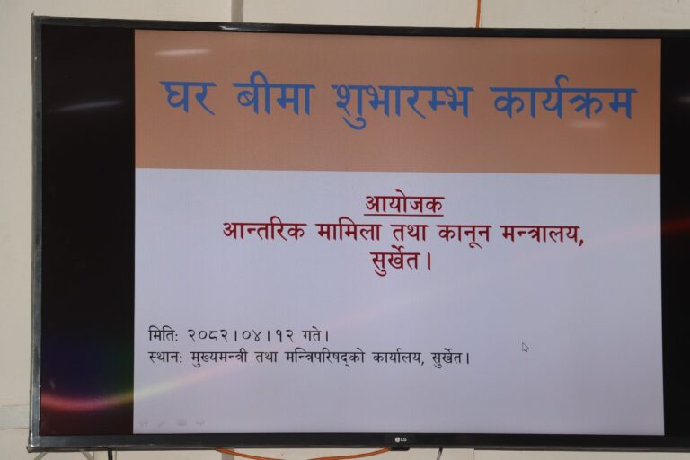 सुर्खेत-प्राकृतिक विपद्को उच्च जोखिममा रहेको कर्णाली प्रदेशमा स्थायी बसोबास गर्ने नागरिकको निजी आवासीय घरमा हुने क्षति र नोक्सानीबाट आर्थिक सुरक्षाको प्रत्याभूति गर्न कर्णाली प्रदेश सरकारले ‘घर बीमा कार्यक्रम’ सञ्चालनमा ल्याएको छ। जस अन्तर्गत पहिलो चरणमा १५ वटा स्थानीय तहका २१३ वडामा १६ हजार घर बिमा गरेको गरिएको हो।