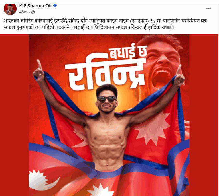 प्रधानमन्त्री ओलीले सामाजिक सञ्जालमा मार्फत एमएफएन च्याम्पियन रविन्द्रलाई शुभकामना दिनुभएकाे हाे।
