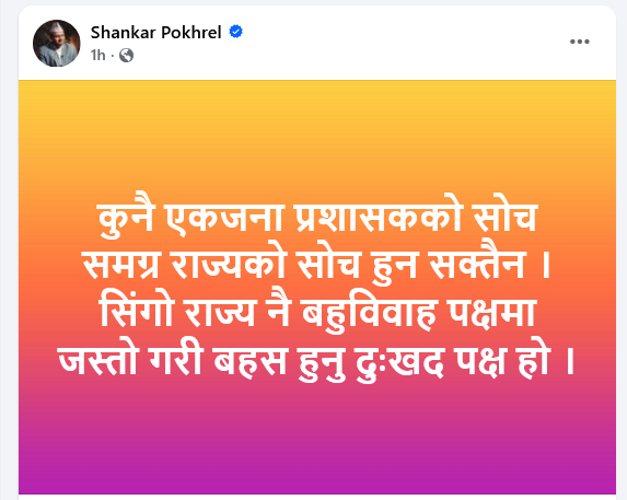 महासचिव पोखरेलले लेख्नुभएको छ, ‘कुनै एक जना प्रशासकको सोच समग्र राज्यको सोच हुन सक्दैन, सिङ्गो राज्य नै बहुविवाह पक्षमा जस्तो गरी बहस हुनु दुःखद पक्ष हो।’