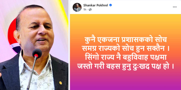 महासचिव पोखरेलले लेख्नुभएको छ, ‘कुनै एक जना प्रशासकको सोच समग्र राज्यको सोच हुन सक्दैन, सिङ्गो राज्य नै बहुविवाह पक्षमा जस्तो गरी बहस हुनु दुःखद पक्ष हो।’