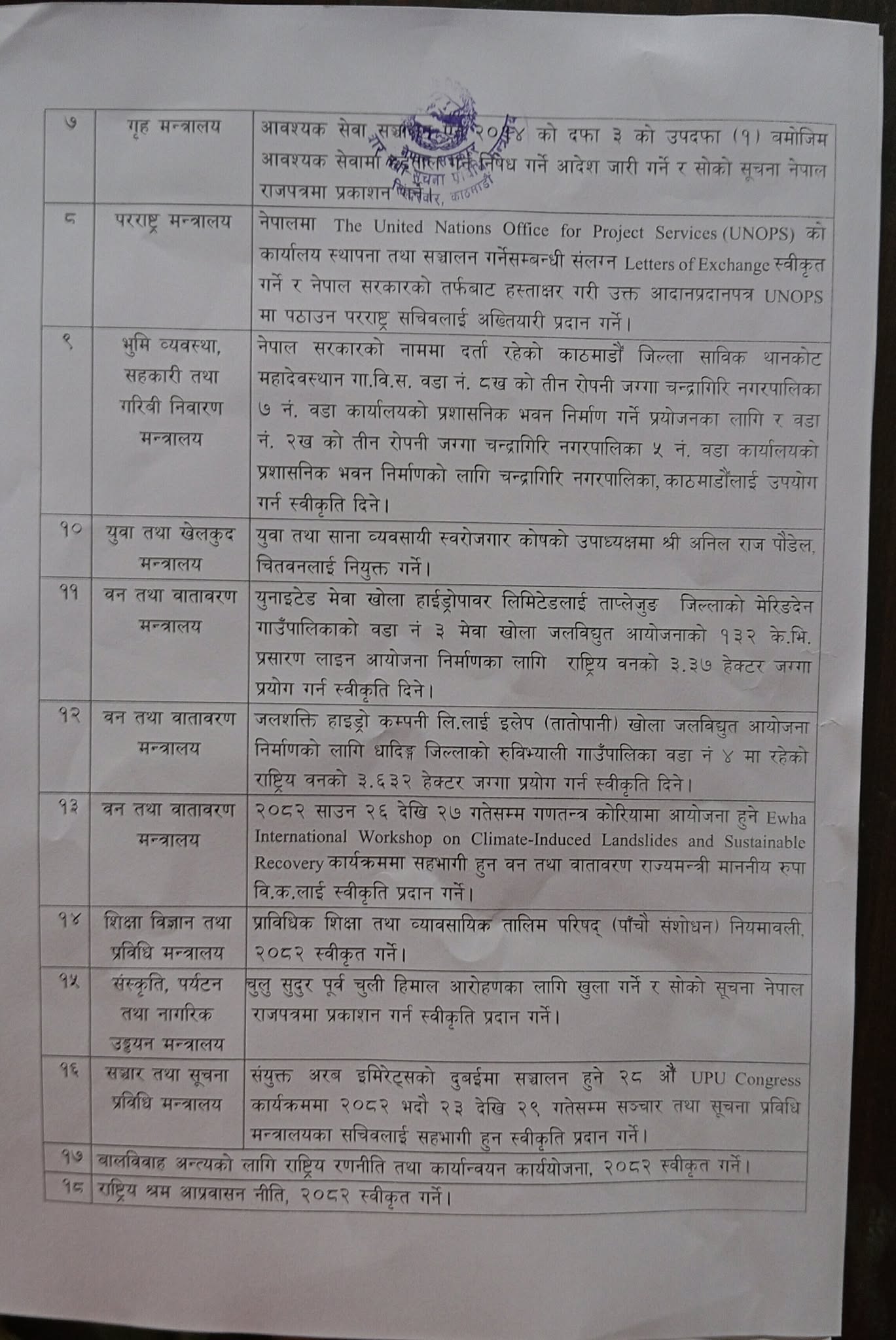 यसैगरी बैठकले नेपालमा संयुक्त राष्ट्रसंघीय आयोजना सेवा कार्यालयस्थापना गर्न स्वीकृति दिने र युवा तथा साना व्यवसायी स्वरोजगार कोषको उपाध्यक्षमा अनिलराज पौडेललाई नियुक्त गर्ने निर्णय पनि गरेको मन्त्री गुरुङले जानकारी दिनुभयाे ।